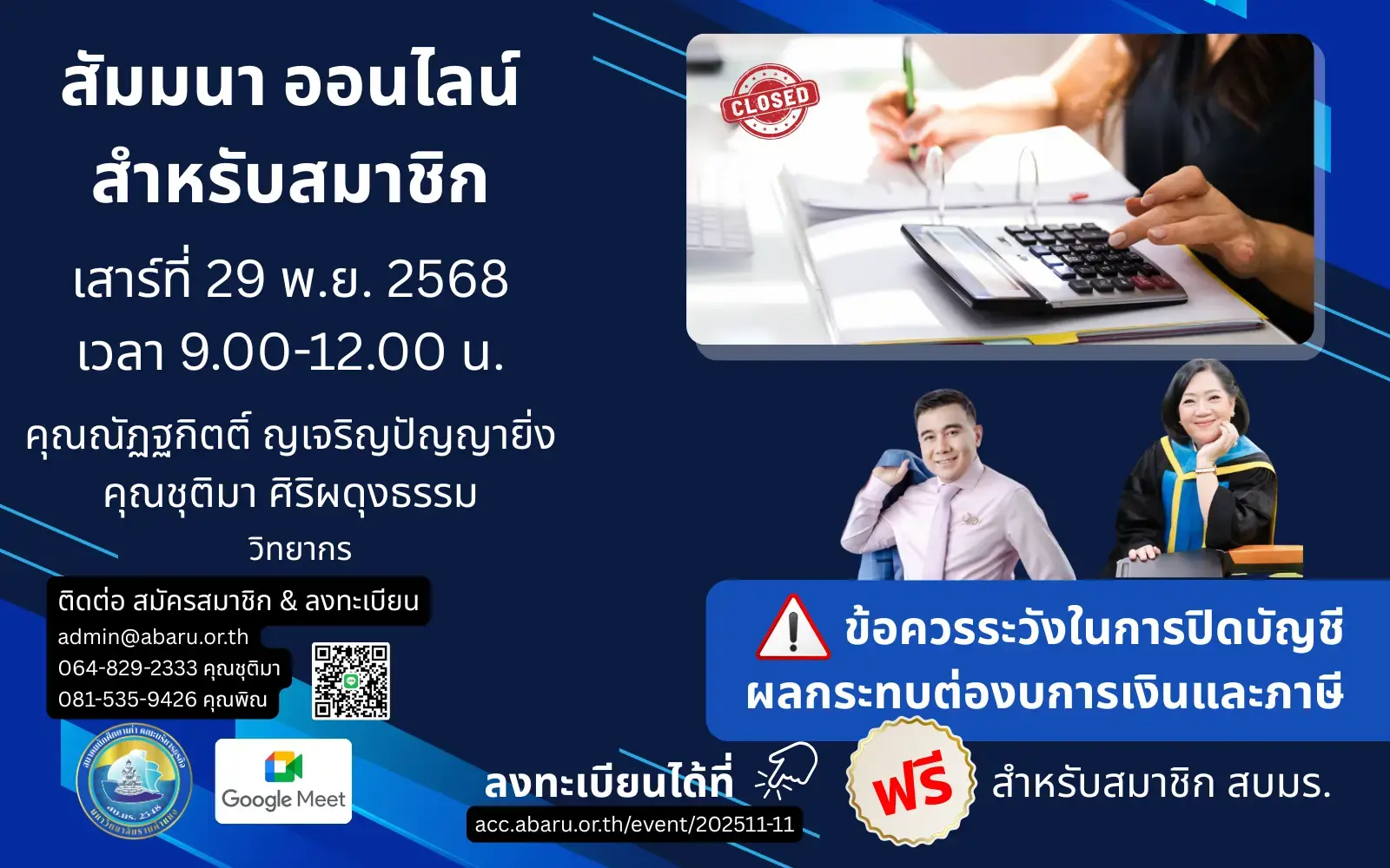 * เพื่อความสะดวกในการเข้าร่วมสัมมนาออนไลน์ แนะนำให้ใช้อีเมล Google , gmail เพื่อเข้าสัมมนาผ่าน Google Meet - นายทะเบียน ขึ้นทะเบียน